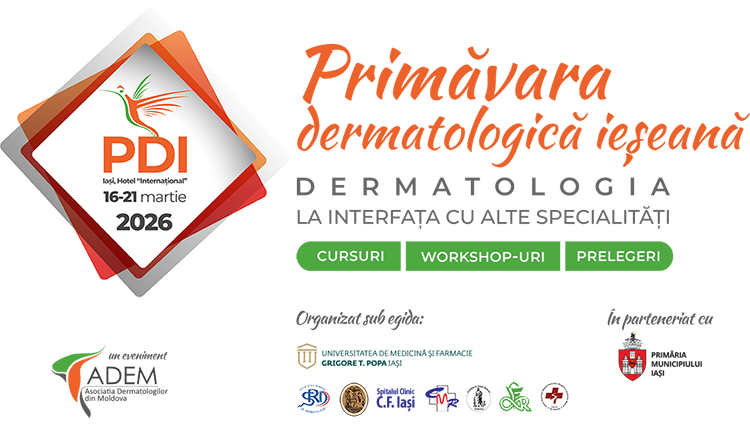 Suntem deosebit de încântați să vă invităm la cea de-a XV-a ediție a Primăverii Dermatologice Ieșene (PDI) 2026, care va avea loc în perioada 16-21 martie, la Hotelul Internațional din Iași!